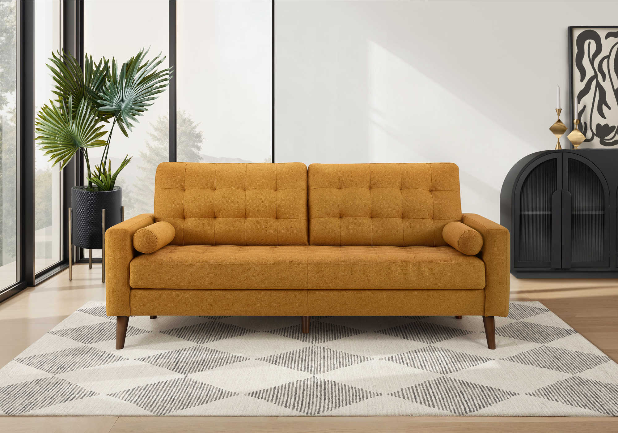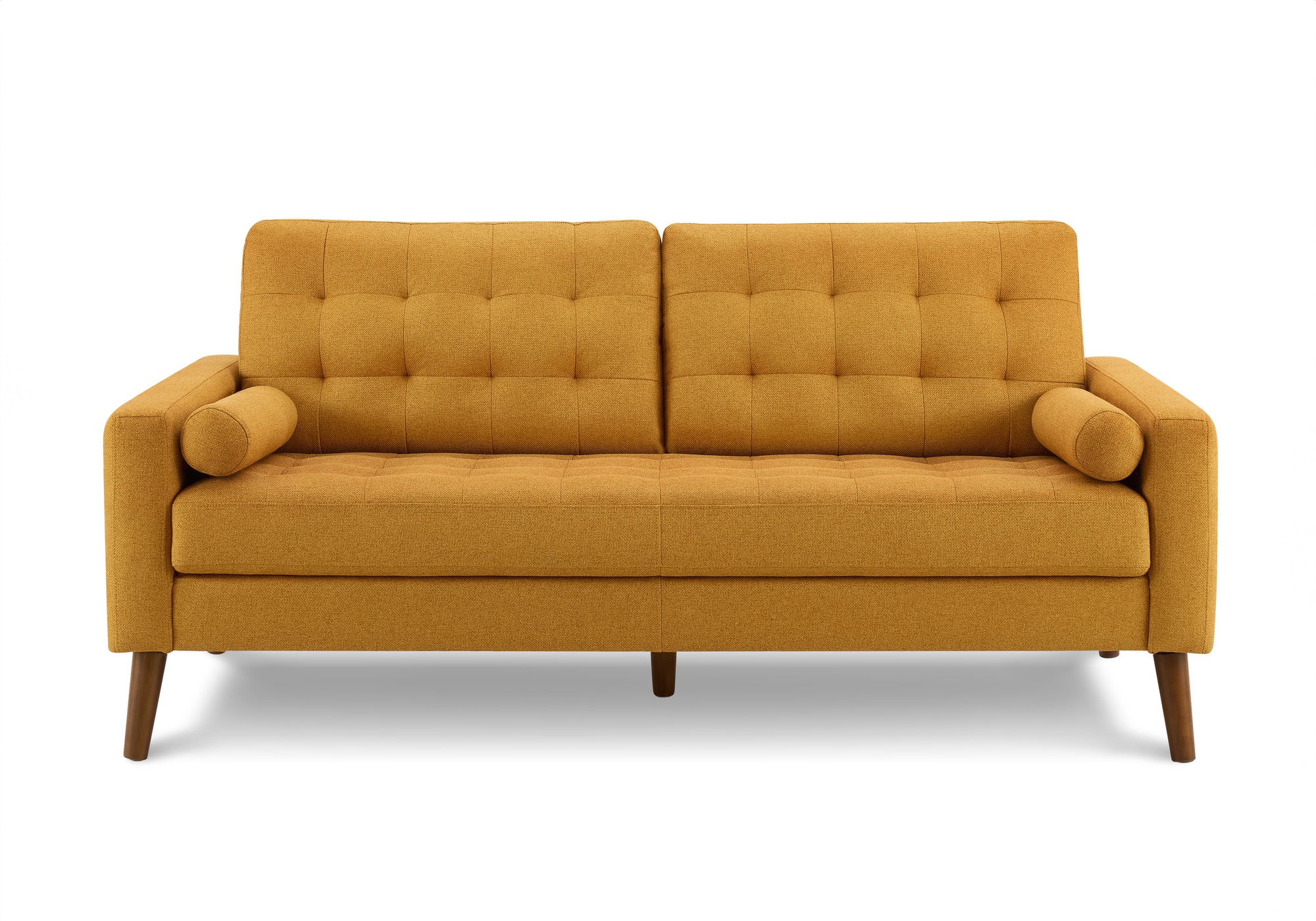 Elevate your space with this sleek 75" long mid century style sofa, upholstered in comfortable orange fabric. Compact yet roomy, this 3 seater sofa features buttonless tufting, no-sag pocket coil springs and removable Dacron-filled back cushions for lasting comfort. Built on a durable solid wood frame with tapered solid wood legs in a warm brown finish. Includes padded square armrests and two matching cylinder bolster pillows for a stylish, finished look. Easy assembly with illustrated instructions included and a 1 year limited warranty against manufacturer defects for your satisfaction.