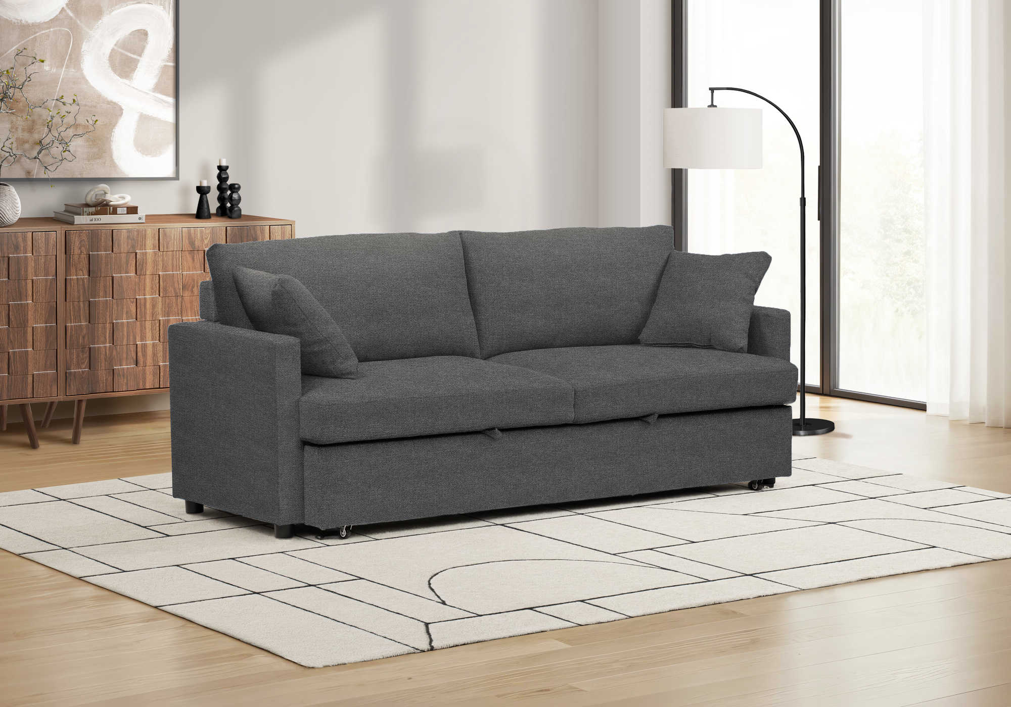 If you are craving a combination of comfort and simple contemporary style, then this stylish and functional sleeper sofa will instantly elevate your space! Upholstered in a sophisticated dark grey fabric with two matching throw pillows, this durable sleeper sofa embodies modern elegance while ensuring durability that stands the test of time. With a generous 78" length, this sofa seamlessly transforms from a chic seating arrangement into a cozy convertible sofa bed, making it perfect for both lounging and accommodating overnight guests. You will appreciate the smooth pull-out mechanism on casters, allowing for effortless transitions from sofa to bed in seconds. The back and wide seat cushions have a pocket spring system topped with high density foam wrapped in Dacron, making it a supremely comfortable seating and sleeping option whether you place it in your living room, family room or office space. Enjoy peace of mind with our 1 year limited warranty, a testament to our commitment to quality and customer satisfaction.